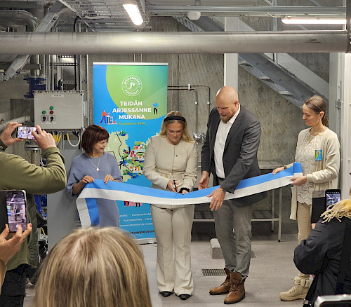 Kuva 1: Kunnanjohtaja Mervi Simoska, valtuuston puheenjohtaja Viivi Immonen, tekninen johtaja Vesa Kankkunen ja vesihuoltopäällikkö Anne Ruotsalainen leikkasivat nauhan perinteisessä seremoniassa. Nauhan leikkaaminen symboloi virallisesti uuden laitoksen käyttöönottoa ja sen merkitystä koko yhteisölle.