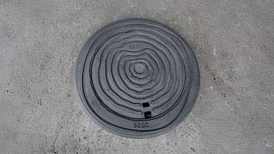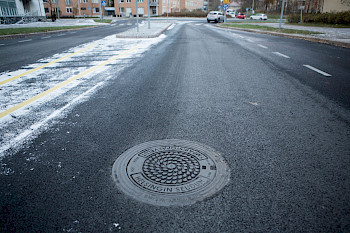 Katualueella sijaitsevat kaivot ovat tärkeitä viemäreiden huoltamiseksi, kuvassa kaivonkansi HSY:n pisaralogolla.(Kuva: HSY)
